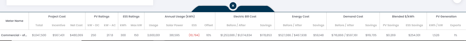 At the bottom of the Edit Proposal page, you will see a blue tab. When hovering over this tab, a drawer will open to display additional values like: Project Cost, PV Ratings, ESS Ratings, Annual Usage, Electric Bill Cost, Energy Cost, Demand Cost, Blended $/kWh, and PV Generation. This drawer can be pinned to the screen so it remains open and unpinned hide it.