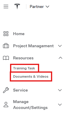 To locate the Tesla training for your Megapack 2XL installation, navigate to the left side of the page and select "Training Task" under the "Resources" drop down menu. All vendor documentation can be located by selecting "Documents & Videos", also under the "Resources" drop down menu.