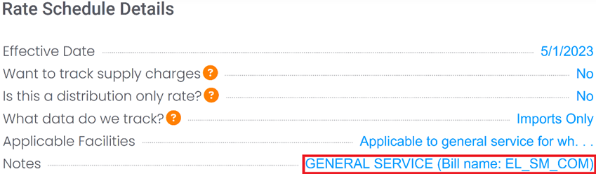 - Our rate names follow the same naming convention as the utility’s official rate tariff documents. Sometimes utilities use a short-hand rate code name for bills instead of the rate name found in the tariff. This discrepancy can cause confusion when using a bill to find the rate in ETB which is why additional rate name information can be found in the notes section within a rate in ETB: