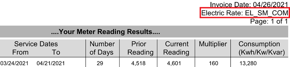 - The electric rate name is found in the top right corner of the bills above the meter reading results section: