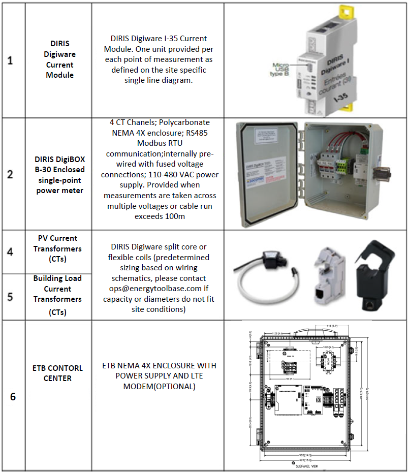 It is the responsibility of the installer to provide an enclosure to mount these additional components inside of(Diris Digibox B30 comes with an enclosure as shown above). Each component comes with DIN Rail brackets, DIN Rail itself must be provided by the installer. Any power supplies needed must be provided by the installer. Each meter component provided will connect via ethernet or RS-485 (please refer to ETB Controller_Socomec HES L Wiring Diagram & Schematic_07.15.2025 - EMS_4 for more detail).